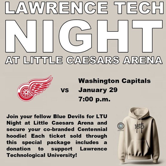 Join your fellow Blue Devils for Lawrence Technological University Night at Little Caesars Arena and secure your co-branded Blue Devils and Red Wings Hoodie! Each ticket sold through this special package includes a donation to LTU Annual Fund. The LTU Annual Fund is the hardest working resource at Lawrence Tech. The LTU Annual Fund provides flexible resources to address the most immediate needs on campus and take advantage of emerging opportunities.