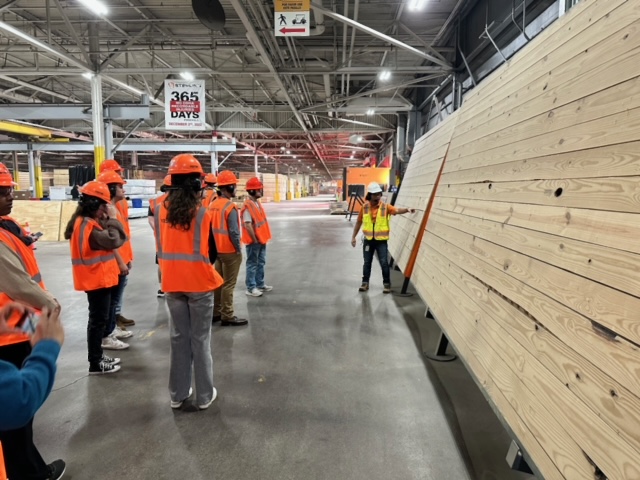Research included a firsthand hard-hat tour of Sterling Structural’s mass timber manufacturing plant. Students observed the entire assembly of a typical CLT (cross-laminated timber) panel, from raw material being unloaded from the semis to the loading of the finished product onto the rail cars/semis to be shipped to the various job sites across the country.